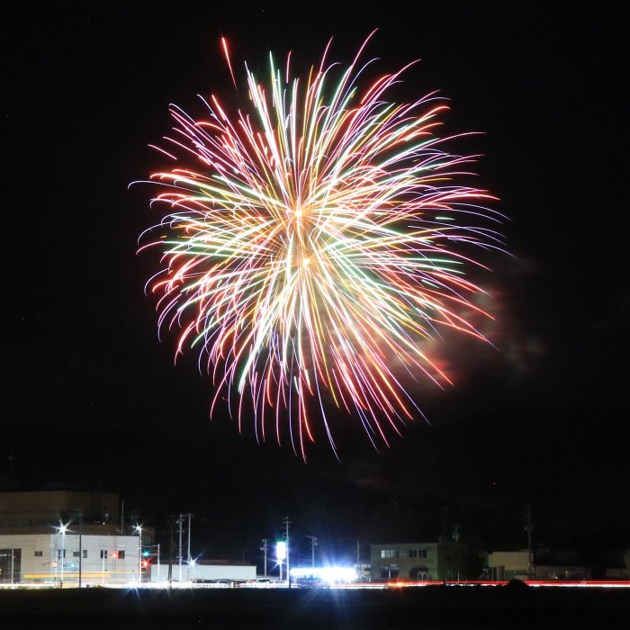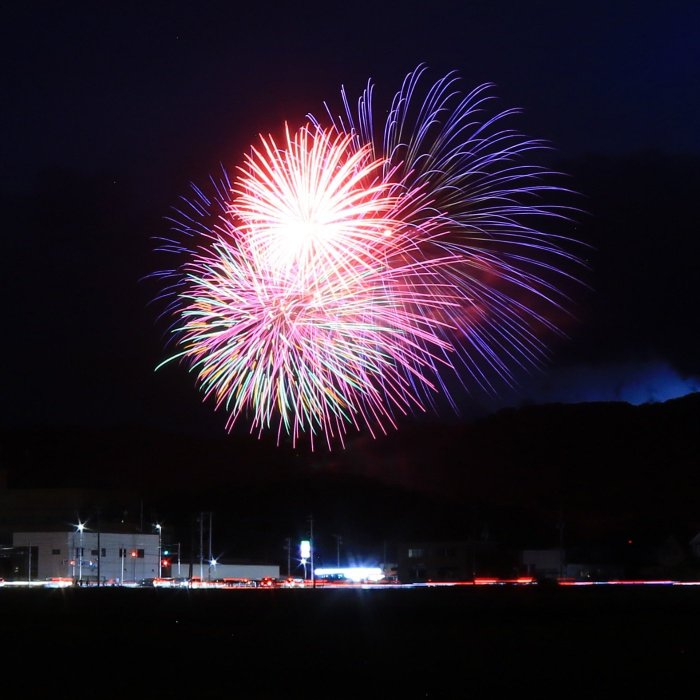 滝祭の会場から離れての撮影でしたが、手前を走る車のテールランプが赤い帯になってます。滝祭の会場でも多くの人達が花火を楽しんでいましたよ。