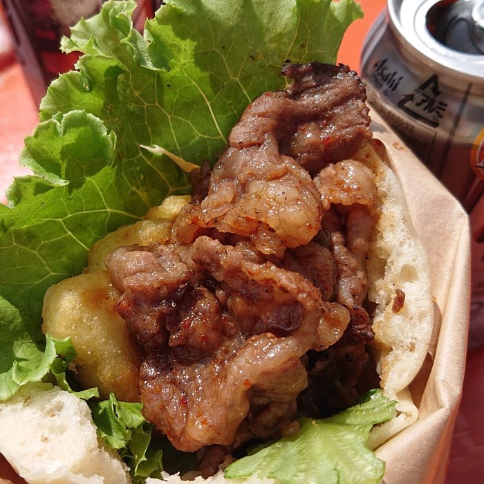 1本で十分なボリュームのチキンステーキ串や、燻製のコーナーでは燻製肉がお安く提供されていたりして、お腹も満足なのでした。「たきざわピタバーガー」は早々に売り切れてしまったようです。明日ならお早めにお求めくださいね。
