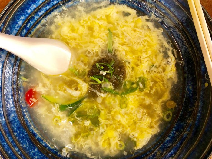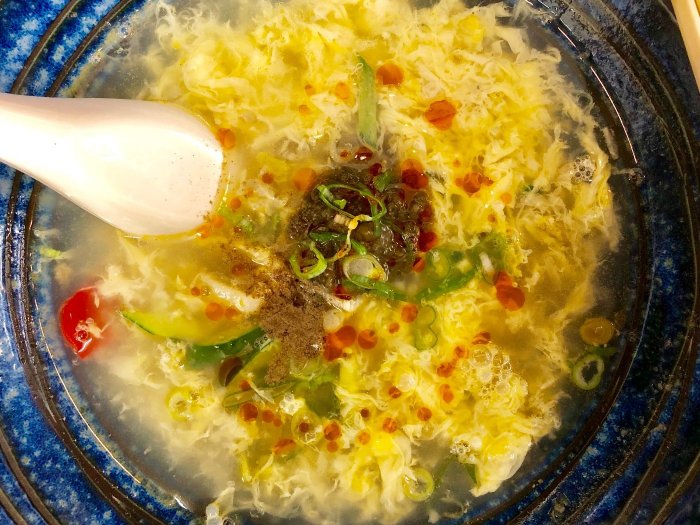 じゃじゃ麺の特徴である「ちーたんたん(卵スープ)」を注文するのですが、お皿に麺や味噌、キュウリなどを少し残しておくのがおすすめです。