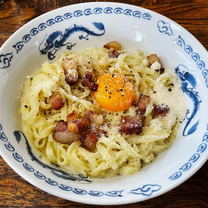 見た目も味もカルボナーラなんだけど、パスタの下にラーメンスープが敷いてあって混ぜるほどにラーメンの味がしてくる、脳バグの変化球。